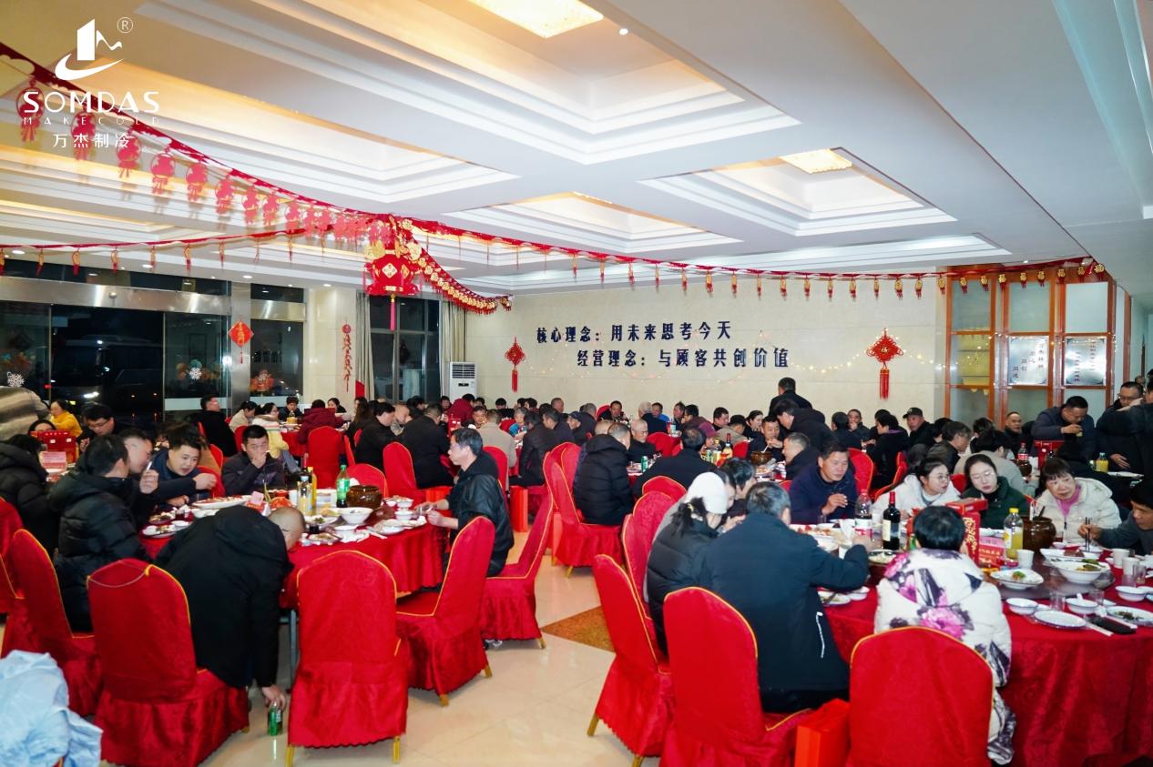 2月6日,团圆的暖意早早笼罩厂区。午后时分,师傅们便细心布置一楼大厅的桌椅,厨师们热火朝天烹制团圆家宴,员工们默契配合,摆好水果、瓜子与热茶,处处是忙碌而温馨的身影。傍晚五点,丰盛的年夜饭暖心开席,客户、合作伙伴们如约而至,与万杰家人围坐一堂,没有生疏的客套,只有家人般的把酒言欢、畅叙衷肠。觥筹交错间,是新春的喜悦,是廿五载的情谊,更是万杰以人为本、以诚相待的人文底色,现场欢声笑语、暖意融融。