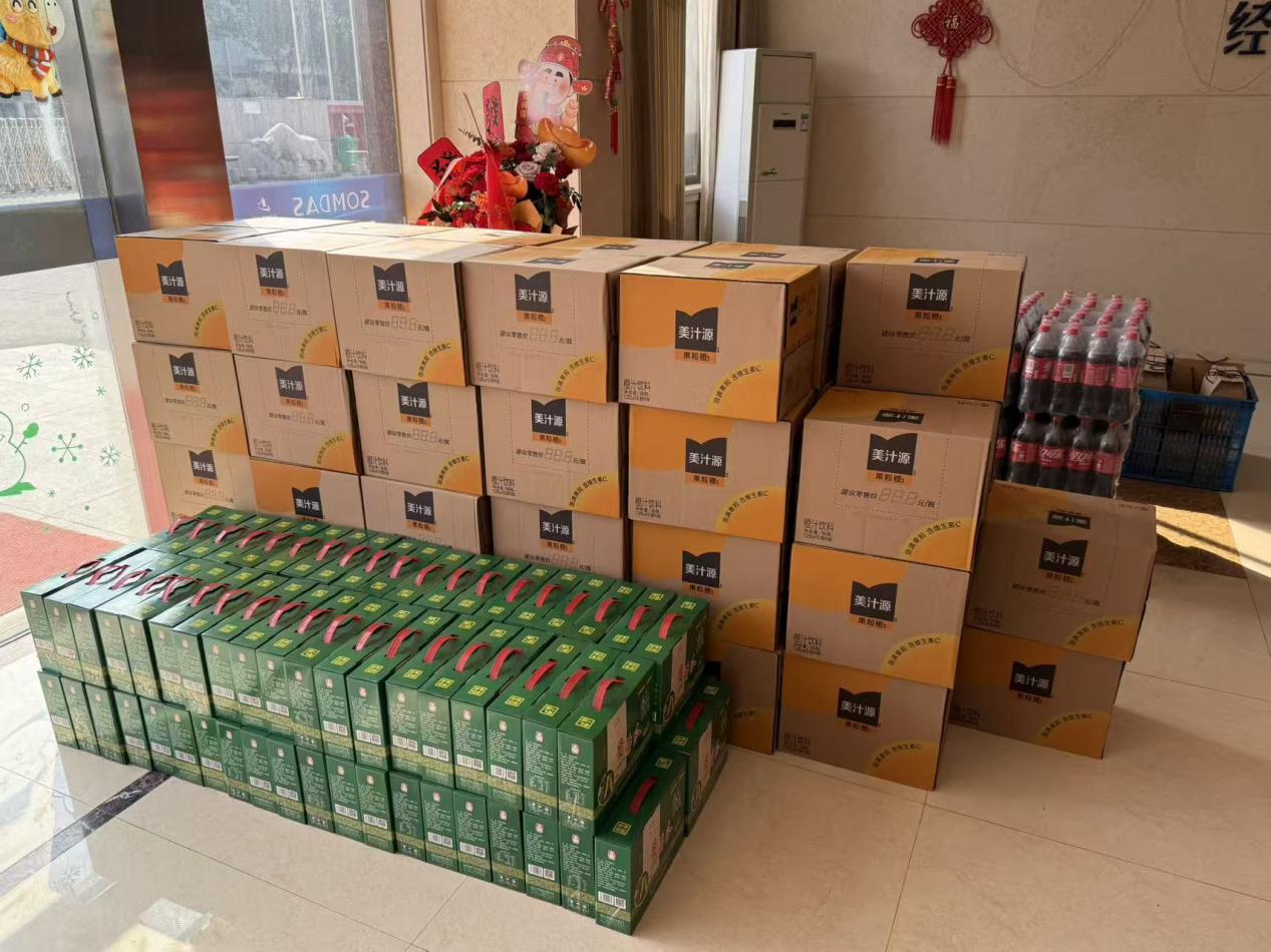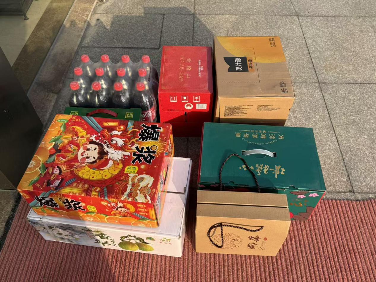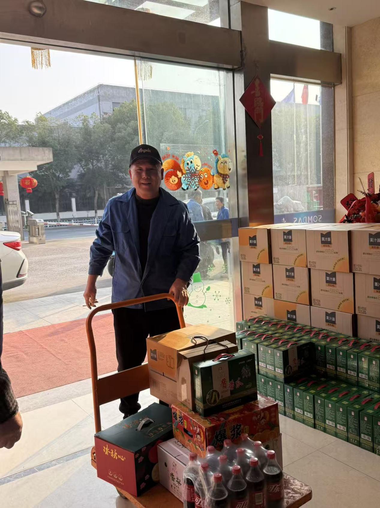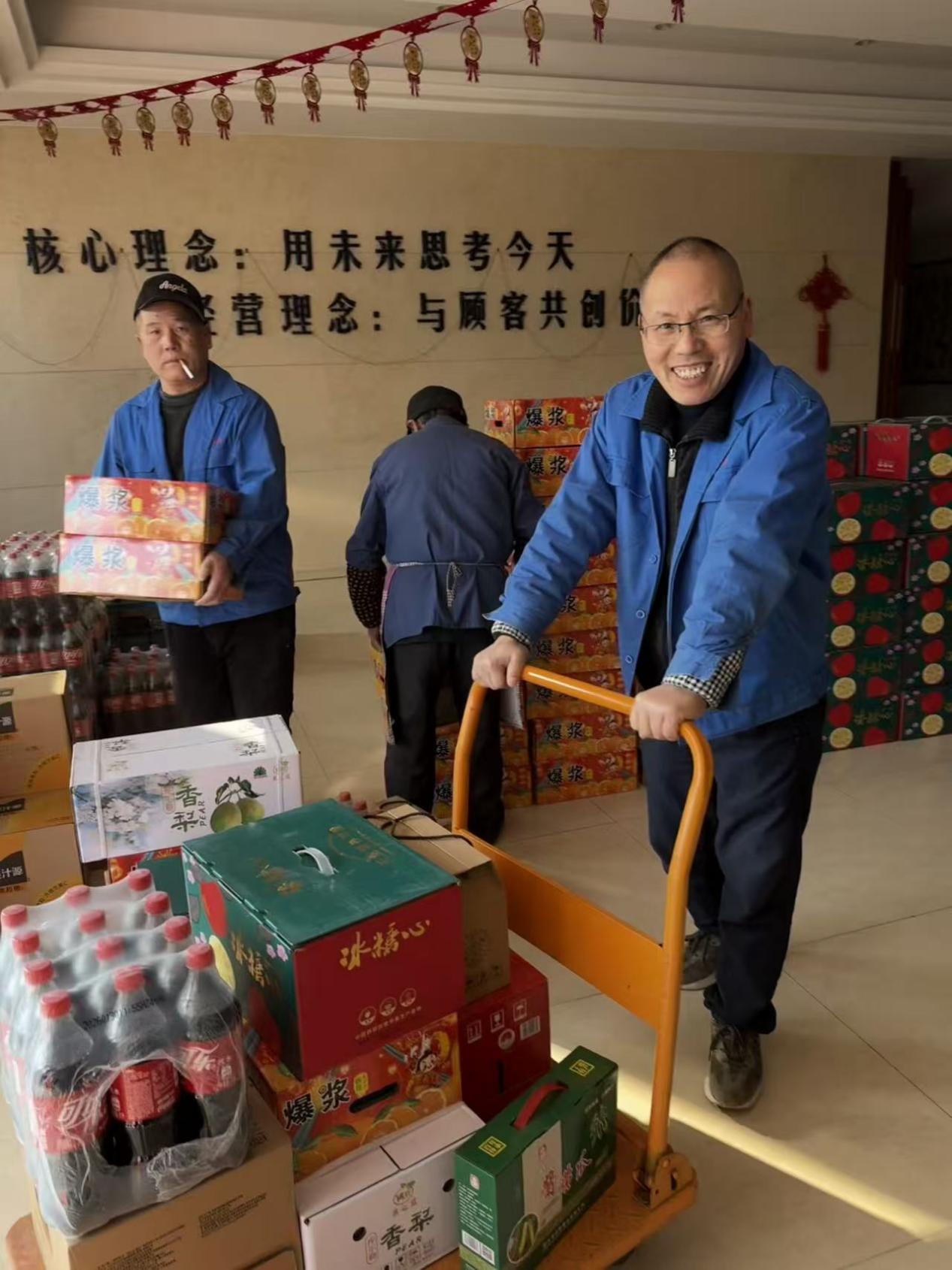 一大早,行政楼一楼就已布置得井井有条,琳琅满目的年货整齐码放,品类丰富,新鲜猪肉、活鸡、鱼、清甜的粑粑柑、香梨、苹果,以及果粒橙、可乐、会稽山老酒、酱黄瓜、蜂蜜等一应俱全,品类丰盛、心意满满,活鸡与鱼提前妥善包装,便于员工携带。十余种年货搭配精心、分量十足,为万杰家人的年夜饭餐桌增添了别样风味,面面俱到的安排,尽显万杰对员工生活的细致考量。